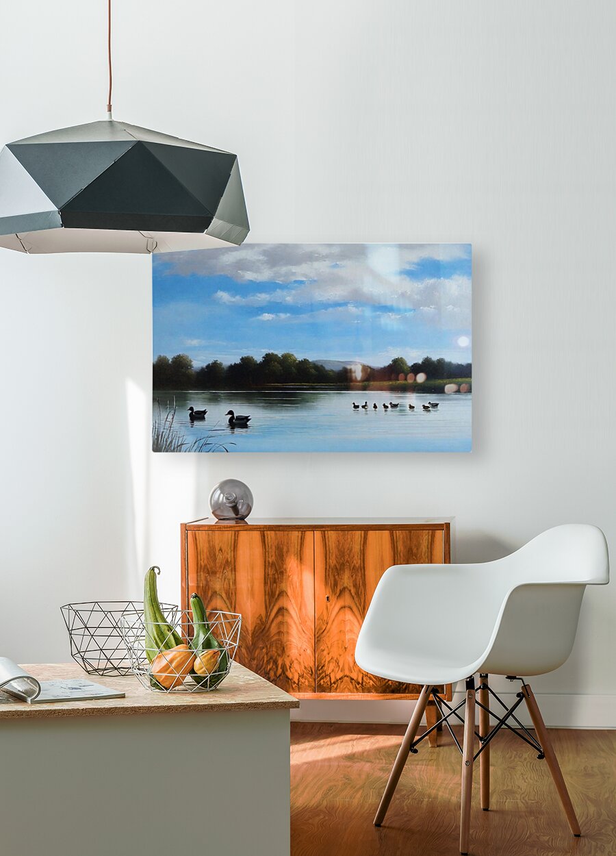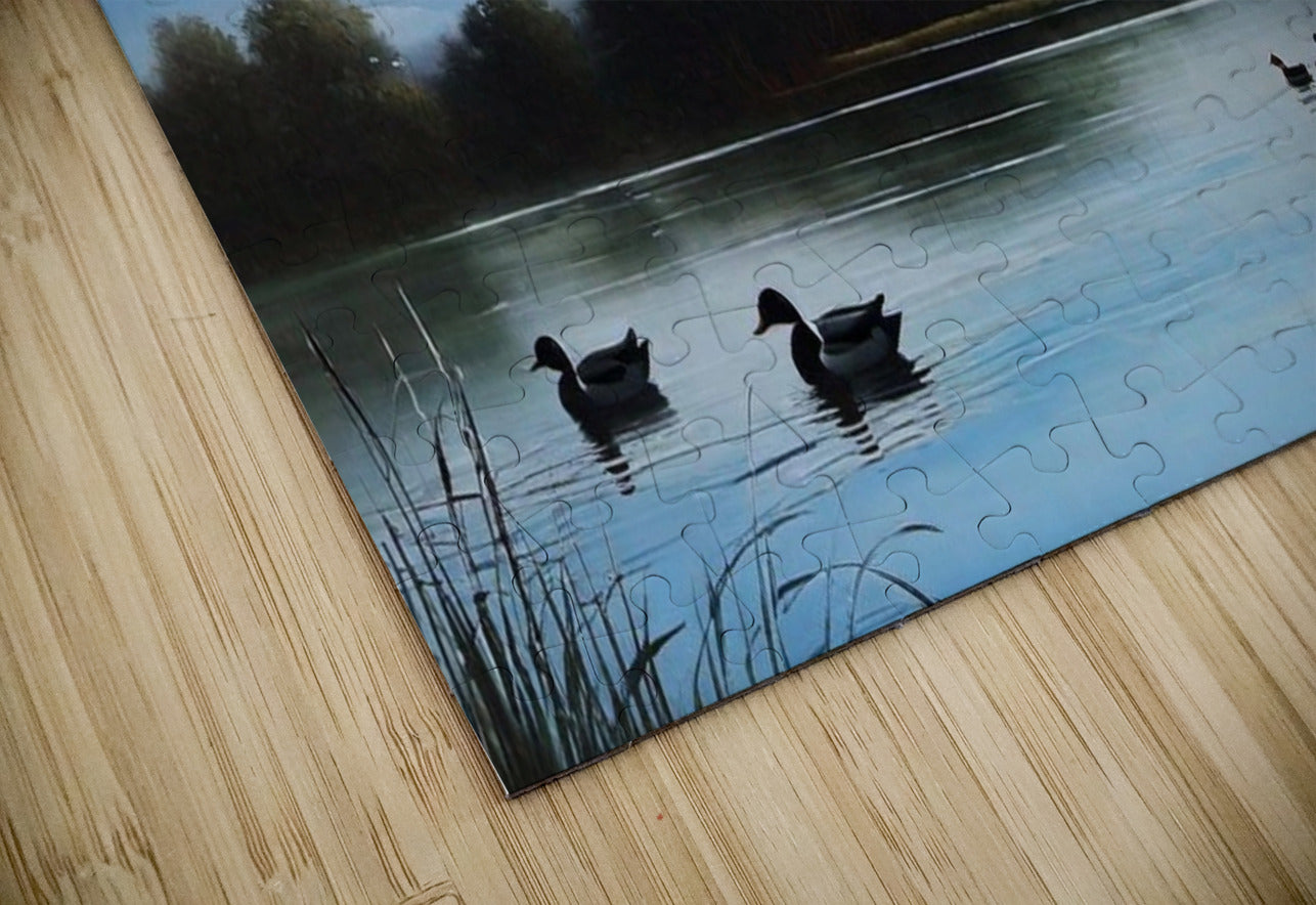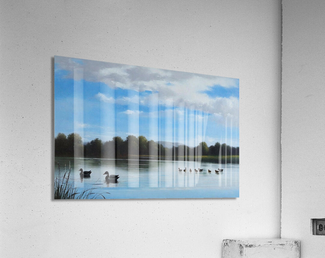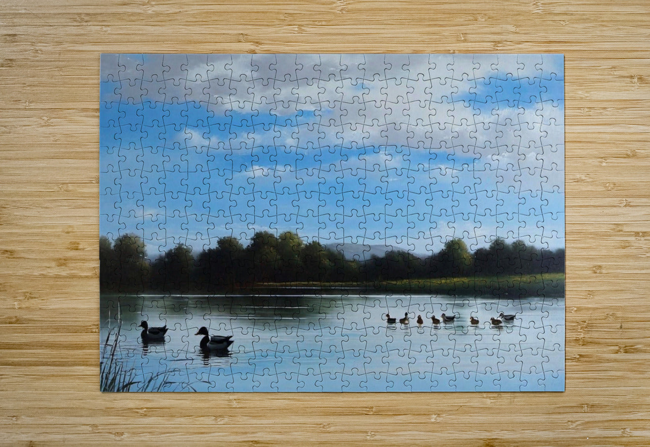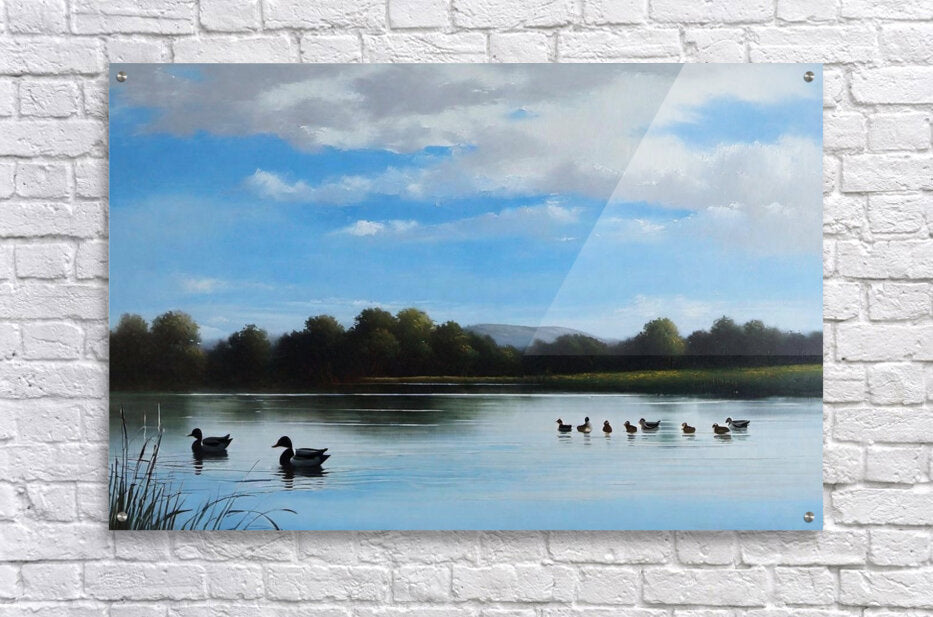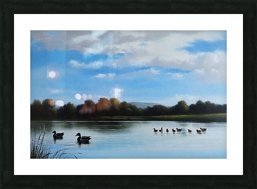 Description: "Duck Season" beautifully portrays a serene lakeside moment, where ducks float peacefully on the calm water, surrounded by lush greenery and a brilliant blue sky. The artist's skillful use of light and shadow creates a realistic and immersive scene, capturing the gentle ripples on the water and the reflections of the trees and clouds.