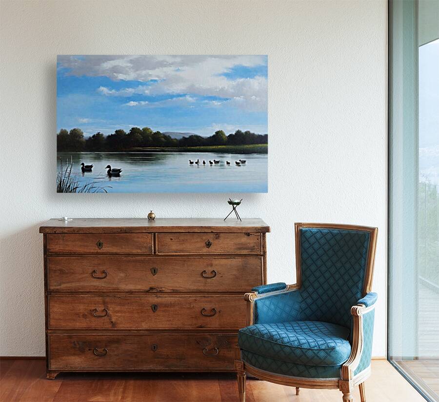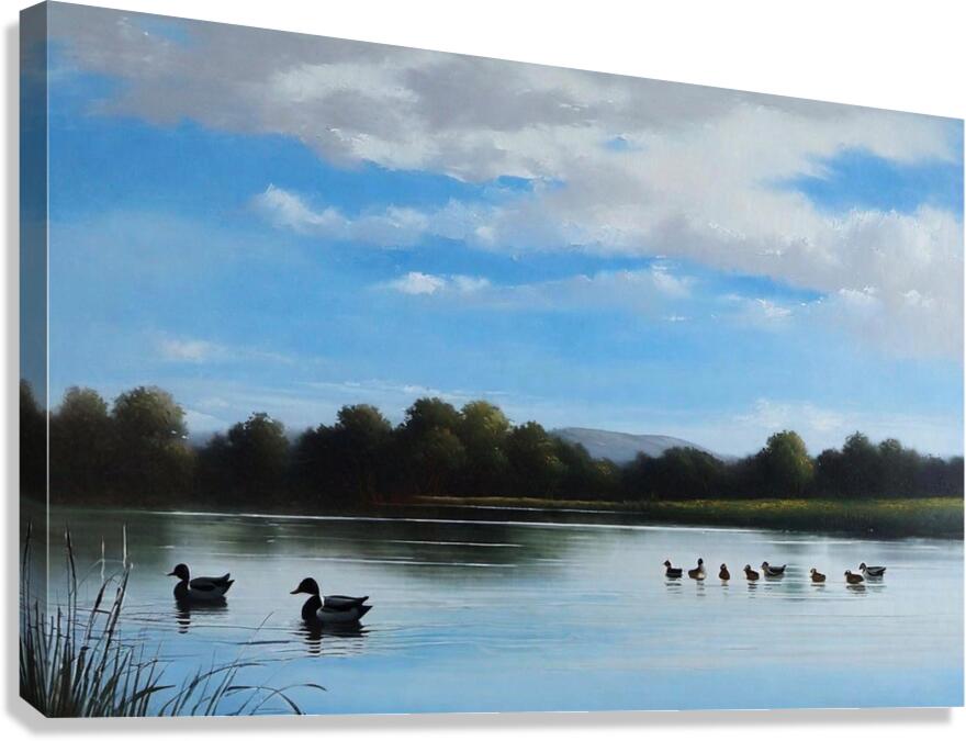 Capture the serene beauty of nature with Constantine Giovanni's exquisite painting, "Duck Season." This tranquil artwork features a peaceful lake scene with ducks gliding gracefully across the water under a clear, blue sky. The artist's meticulous attention to detail and use of soft, natural colors evoke a sense of calm and harmony, making this piece a perfect addition to any space.